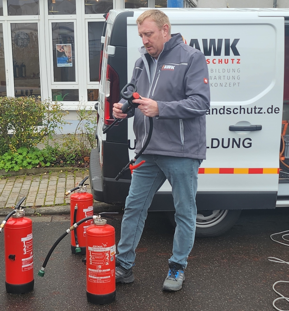 Bei uns gab es dafür eine aktuelle Auffrischung. Von Profis, die sich richtig gut auskennen. Einiges wurde in der Theorie besprochen und gezeigt. Aber dann ging es auch in die Praxis. Wie bedient man denn nun den Feuerlöscher? Wie gut, dass man vorher erfahren hatte, welche unterschiedlichen Feuerlöscher es gibt!